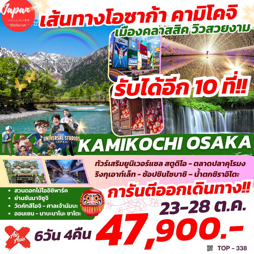เที่ยวญี่ปุ่น ชมความงดงามของทิวทัศน์ ช่องแคบทาคาจิโฮะ - จุดชมใบไม้เปลี่ยนสี ป่าแห่งศิลปะสิ่งแวดล้อม - แสวงบุญที่ วัดนันโซอิน - พักออนเซ็น 1 คืน พักคุมาโมโตะ 2 คืน - วัดไดโคเซ็นจิ - ศาลเจ้ายูโทคุ อินาริ – หมู่บ้านโอคาวาจิยามะ - โทซุ พรีเมียม เอาท์เล็ท - ปราสาทคุมาโมโตะ - ซากุระโนะบาบะ โจไซเอ็น - ช้อปปิ้งชิโมะโทริ – กันดั๊ม ปาร์ค ฟุกุโอกะ – ช้อปปิ้งเทนจิน